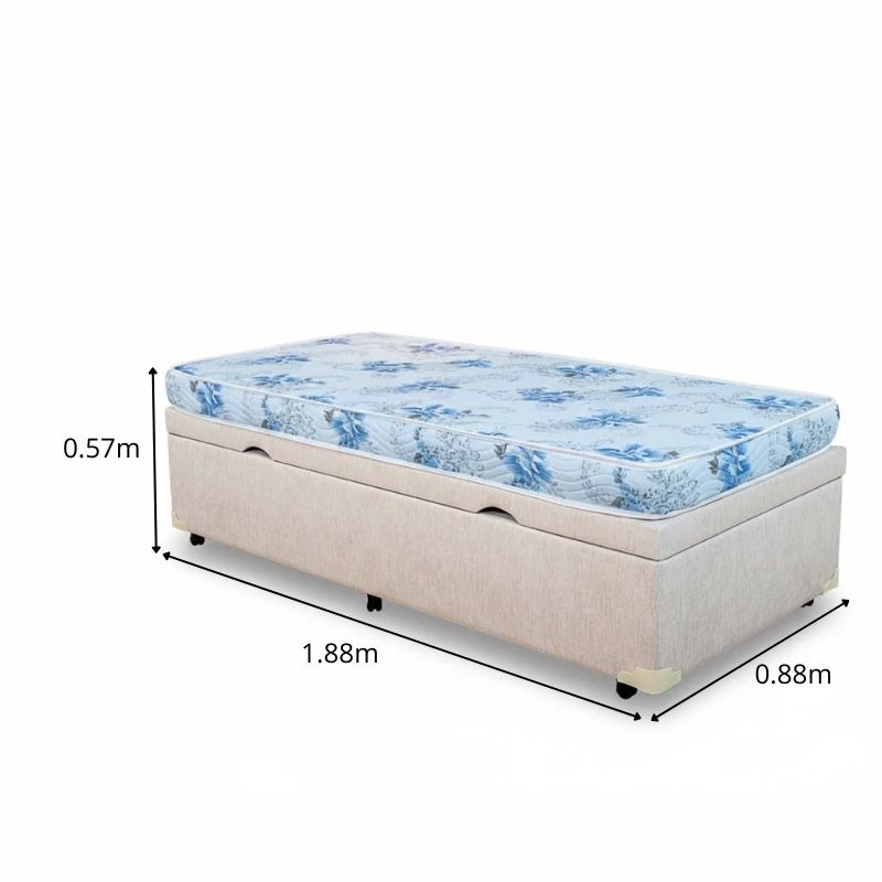 A base box solteira produzida em madeira de eucalipto, revestida em Korino Linho e conta com pés de 7 cm, pistões robustos e amplo espaço interno. Blindada e resistente, suporta até 130 kg por pessoa.