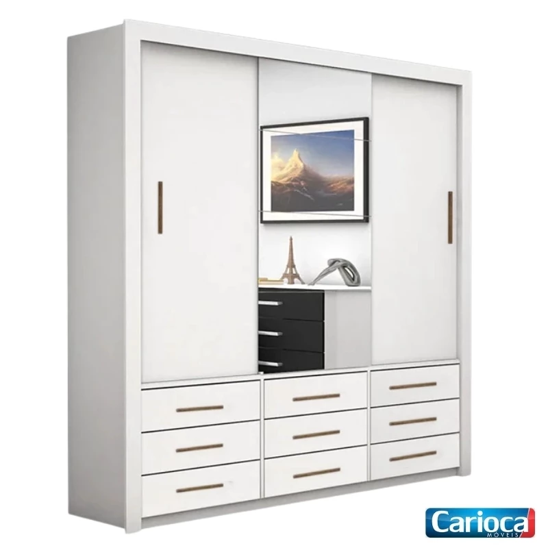 Guarda-Roupa Casal Anjos Branco 3 Portas 9 Gavetas C/ 1 Espelho Larg. 1.91m – Carioca