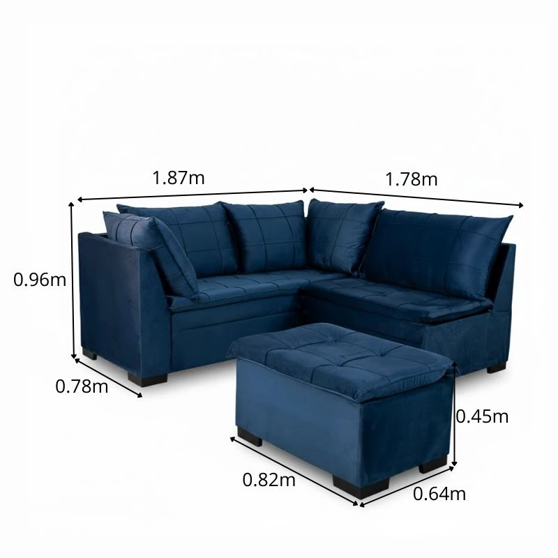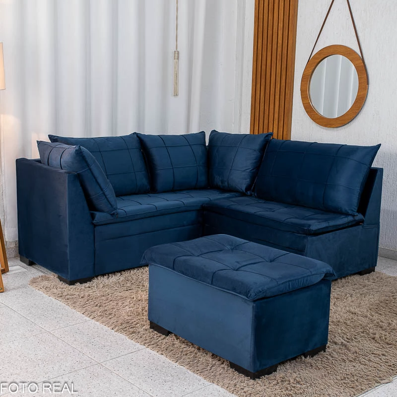 Sofá Canto 5 lugares com Puff Viena Veludo Azul A16