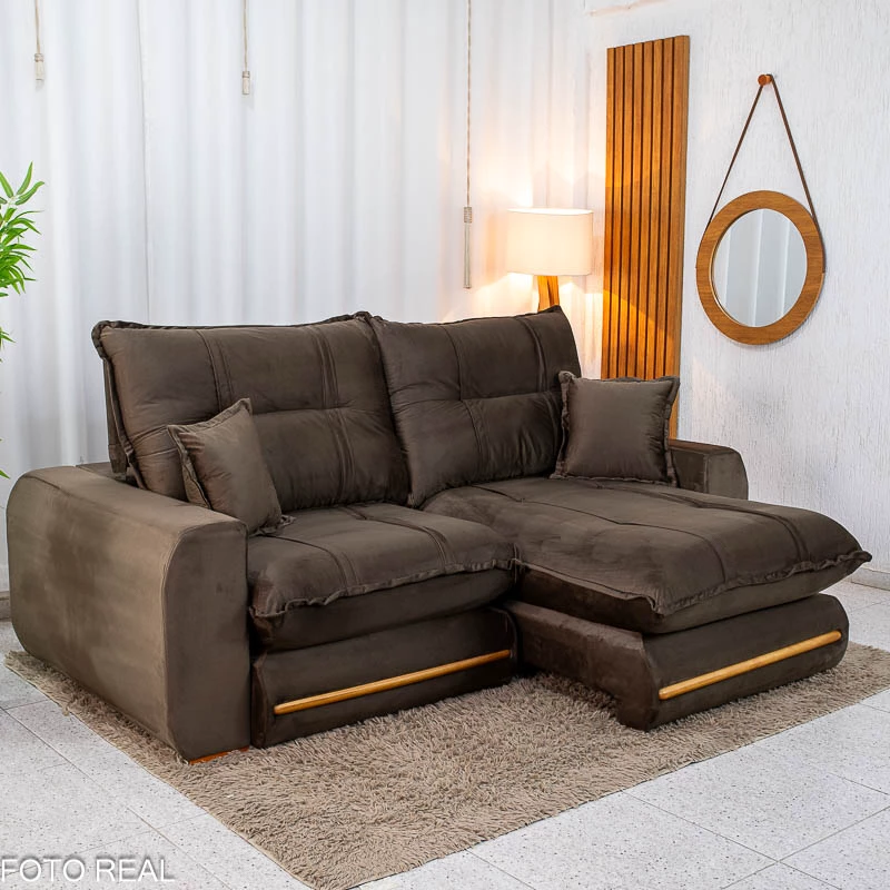 Sofá Retrátil Reclinável Chicago 2.50m Veludo Marrom A17 – Molas Ensacadas Medidas: – Largura: 2.50m – Altura: 1.10m – Assento fechado: 1.25m – Assento aberto: 1.80m – Altura do assento até o chão: 0.52m – Largura dos braços: 0.25m – Sofá retrátil para até 5 pessoas – Passa em portas de 0.75m Assento: – Tipo: Retrátil com corrediças em tubo de ferro – Pillow Top: 25 cm de espessura – Espuma: D28 Soft de alta densidade – Molejo: Molas ensacadas Pocket individuais – Sustentação: Percintas elásticas de alta resistência – Rodízios: Rodinhas siliconadas que facilitam o deslizamento Encosto: – Tipo de encosto: Reclinável com várias posições – Enchimento: Fibra de poliéster siliconado de alto conforto – Sistema de inclinação: Catraca de ferro blindado Braços: – Levemente arredondados, proporcionando um visual moderno e aconchegante. Estrutura: – Tipo de madeira: Eucalipto de reflorestamento Revestimento: – Tecido: Veludo. Peso indicado: – Recomendado até 120 kg por pessoa Bônus: – Acompanha almofadas decorativas Aviso importante: Informamos que é normal haver uma abertura entre os módulos dos sofás retráteis. Essa abertura é necessária para evitar atrito entre os módulos durante o movimento de abrir e fechar, prevenindo o desgaste do tecido.