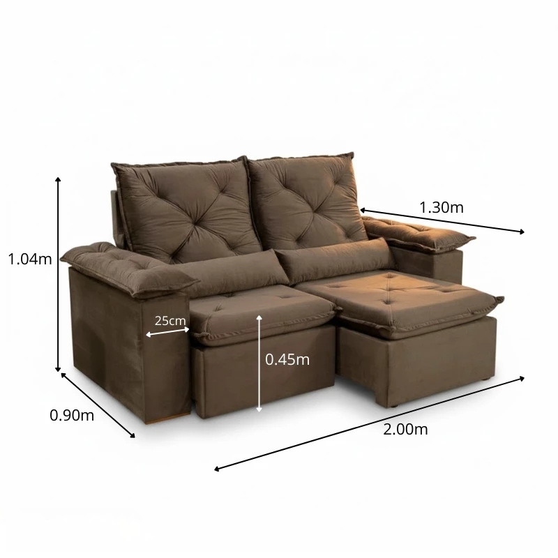 Sofá Retrátil Reclinável Chicago 2.50m Veludo Marrom A17 – Molas Ensacadas