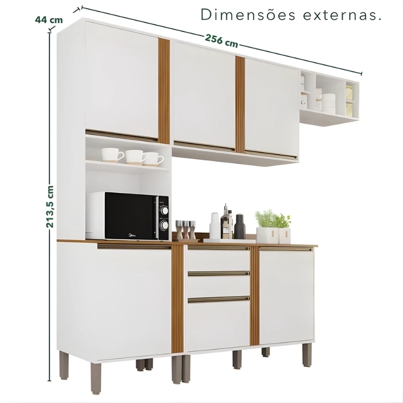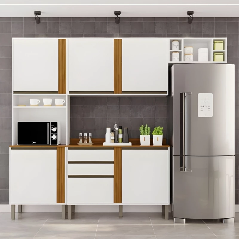 Torre Quente Cozinha Pérola + Balcão 1.20m + Aéreo 2 Portas 1.20m + Armário de geladeira Pérola Branco/Cinamomo – Sallêto